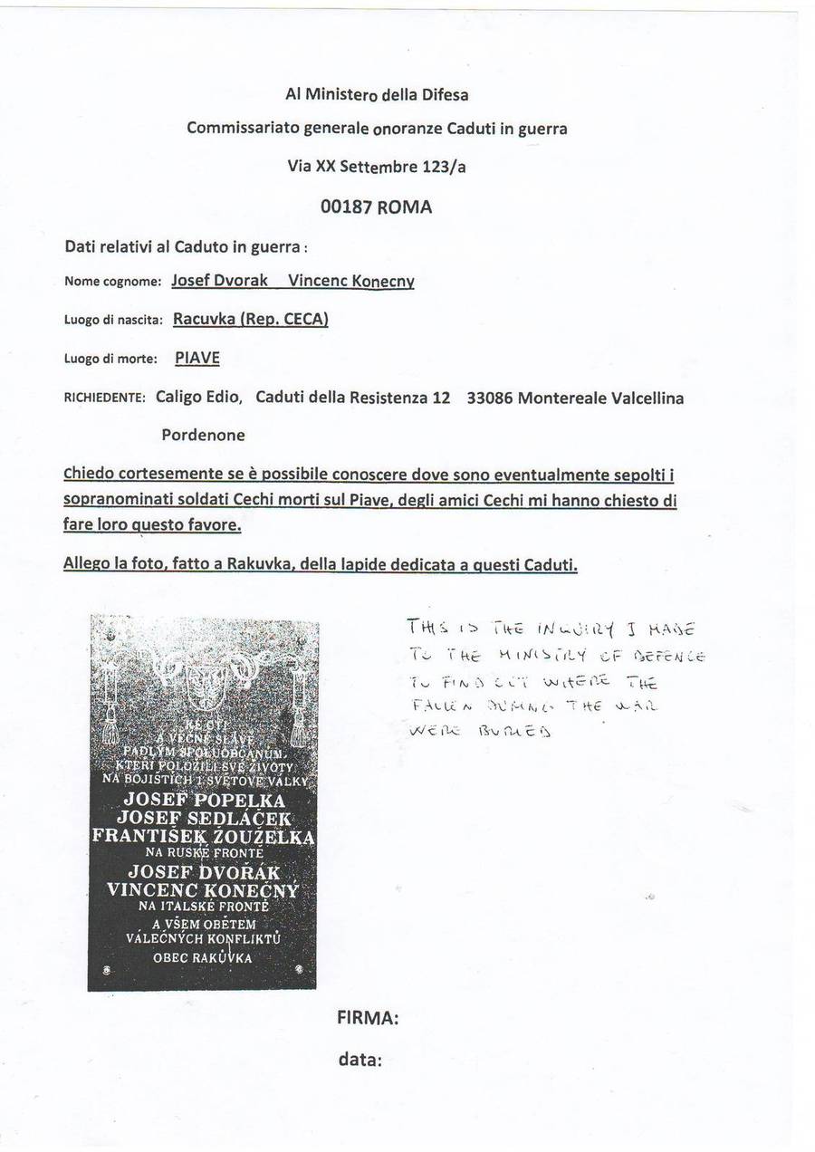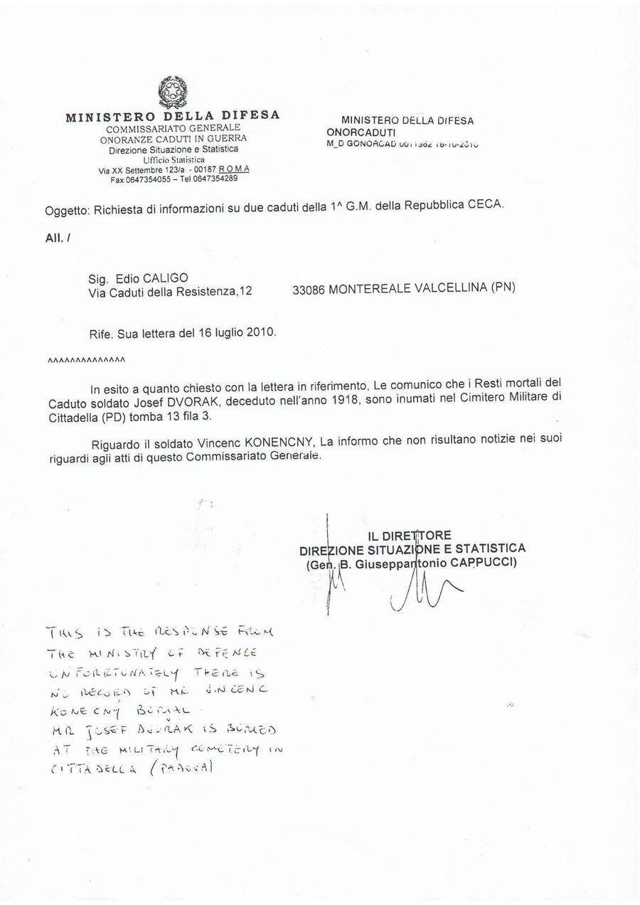 Z překladu vyplynulo, že Josef Dvořák padl v roce 1918 na Piavě a pochován je v Cittadelle na vojenském hřbitově ve třináctém hrobu třetí řady. Jeho kolega Vincenc Konečný z Rakůvky byl prohlášen za nezvěstného.