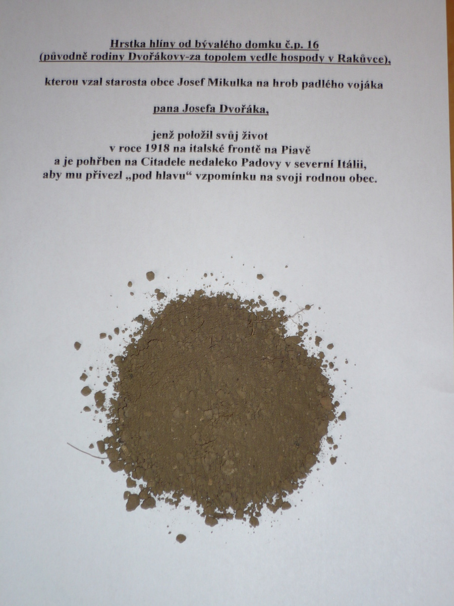 Celý příběh započal již před sedmi lety. Tehdy se zastupitelé Rakůvky rozhodli pro novou pamětní desku věnovanou padlým v první světové válce. Podle kroniky zjistili, že třem rodákům se stal osudný boj za vlast na ruské a dvěma na italské frontě. Jedním z nich byl i Josef Dvořák.